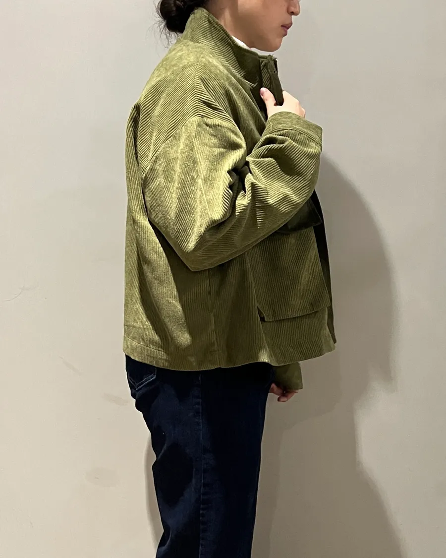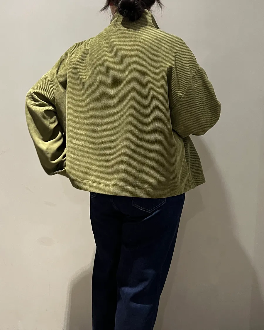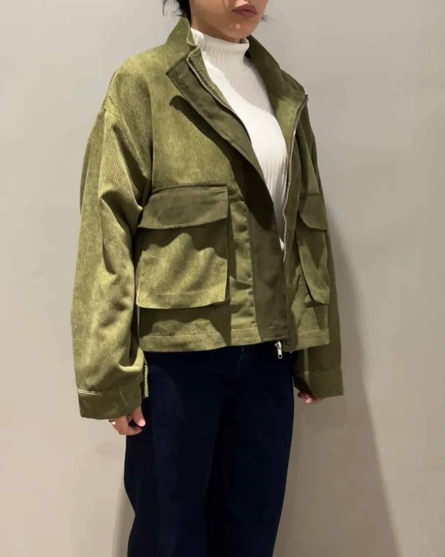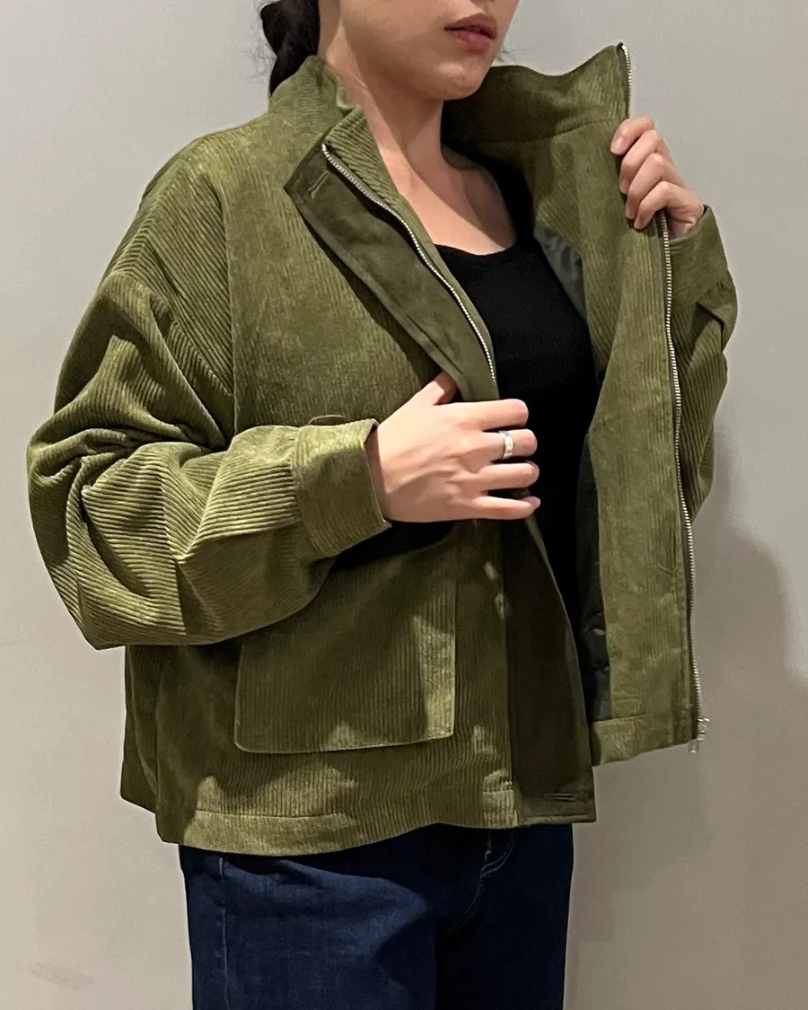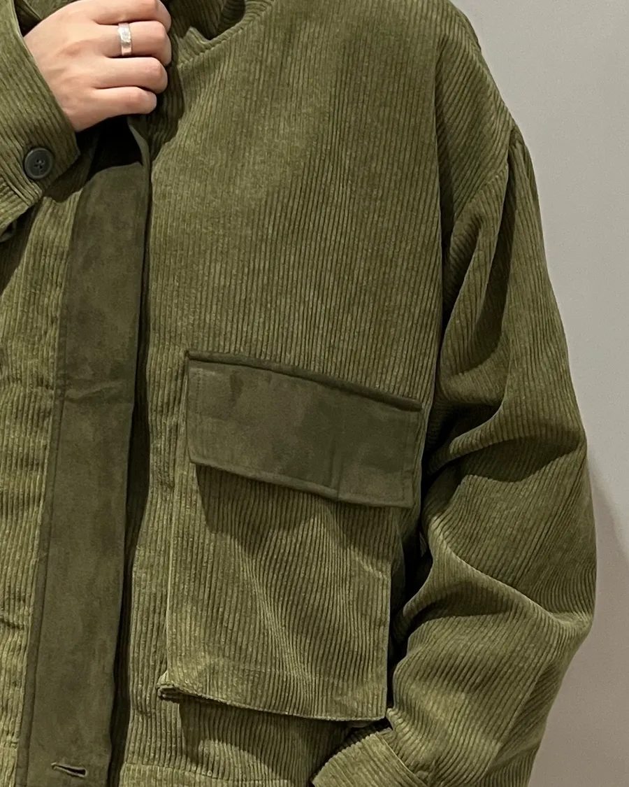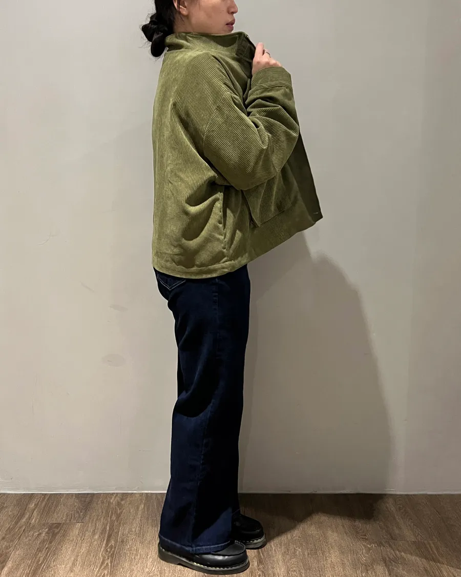 這件立領外套當時躺在韓國檔口衣服堆中不起眼的角落,但完美雪松綠完全眼睛發亮,寬版大口袋設計,搭配燈心絨布料自帶的造型感,想低調又獨特的選這件。