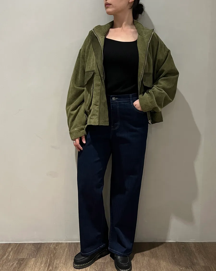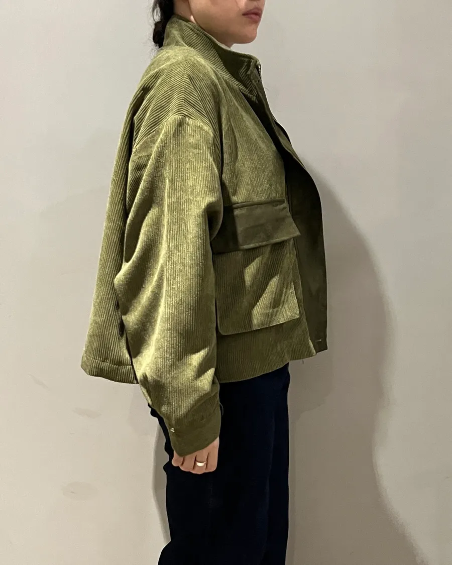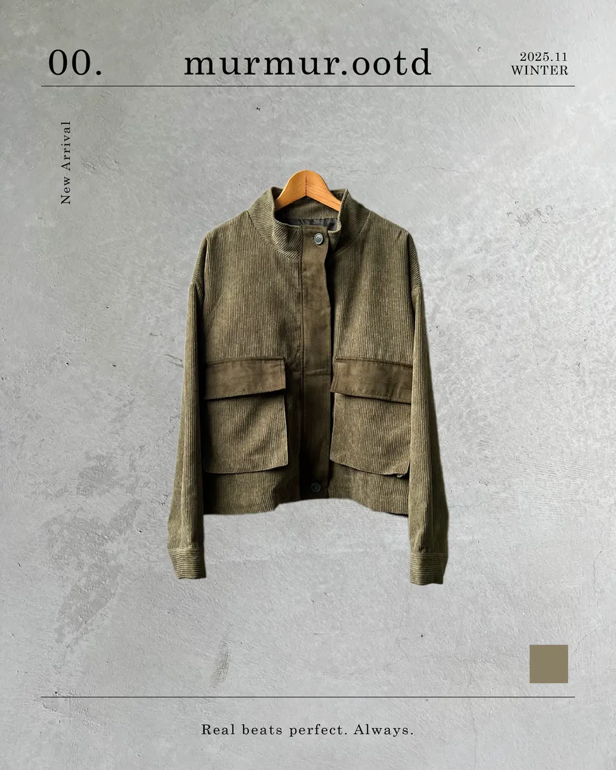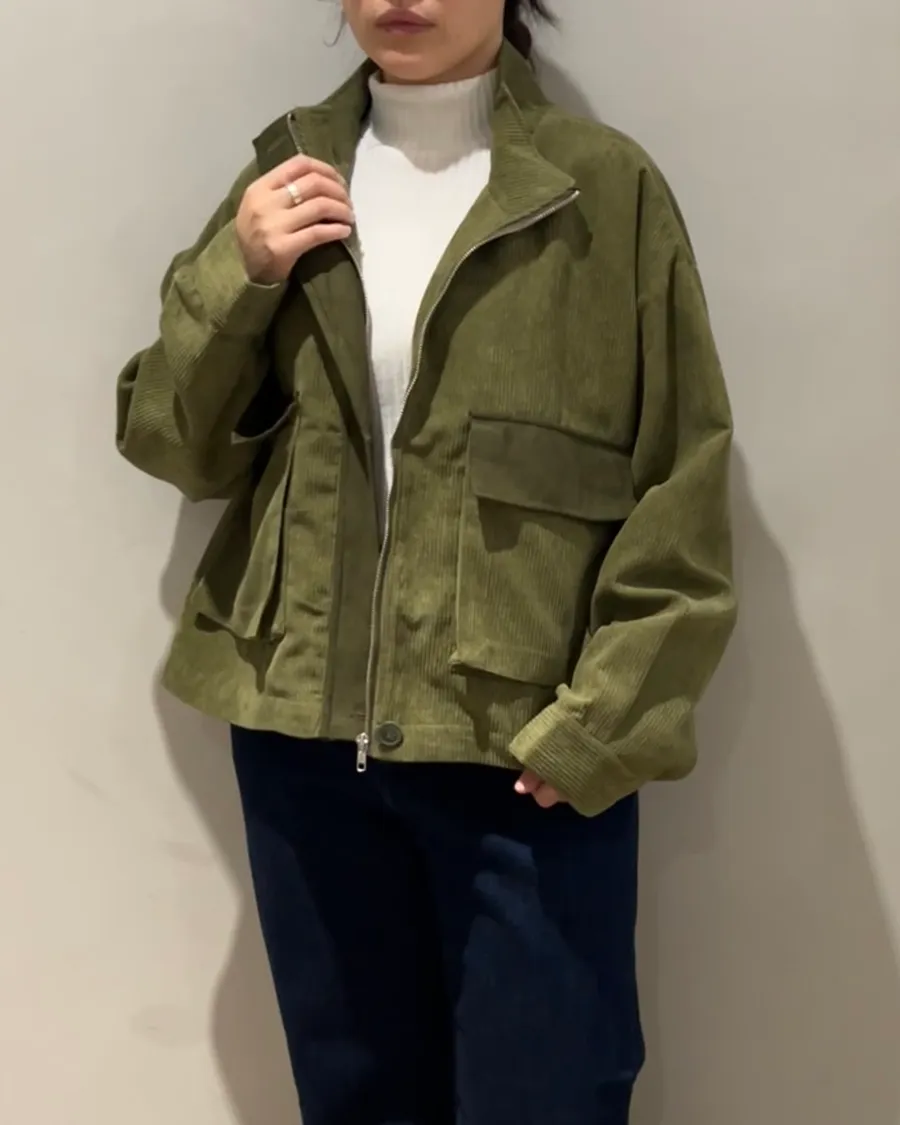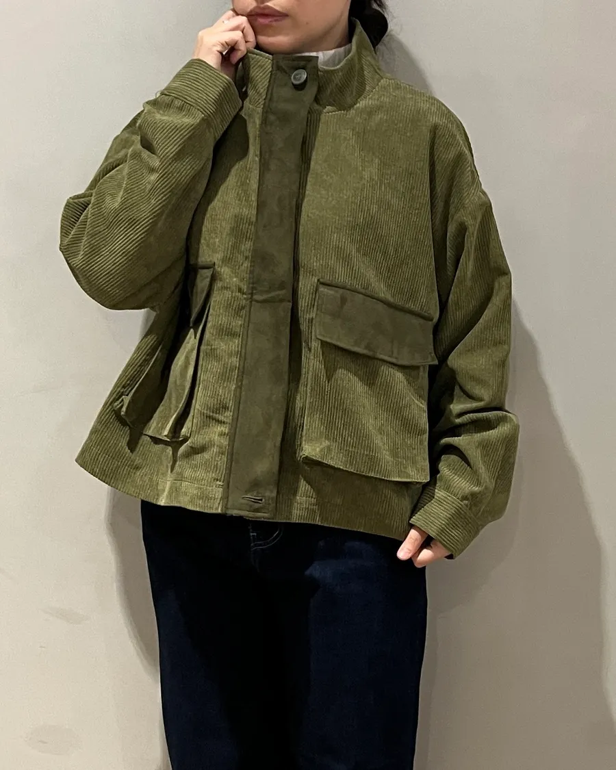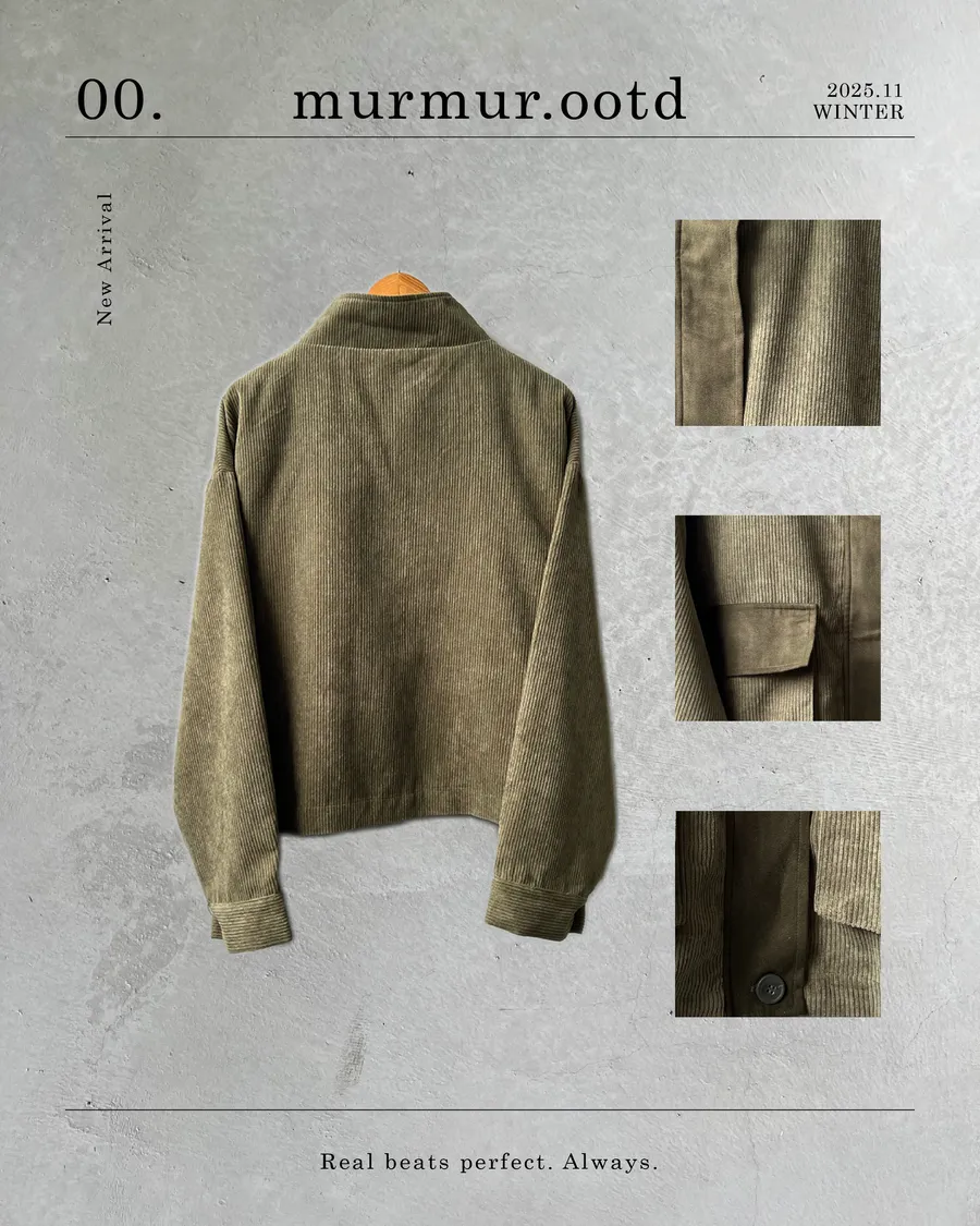 這件立領外套當時躺在韓國檔口衣服堆中不起眼的角落,但完美雪松綠完全眼睛發亮,寬版大口袋設計,搭配燈心絨布料自帶的造型感,想低調又獨特的選這件。