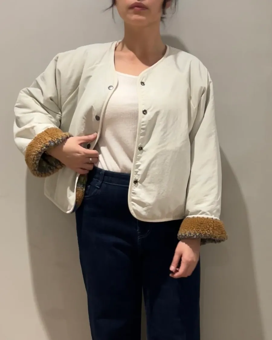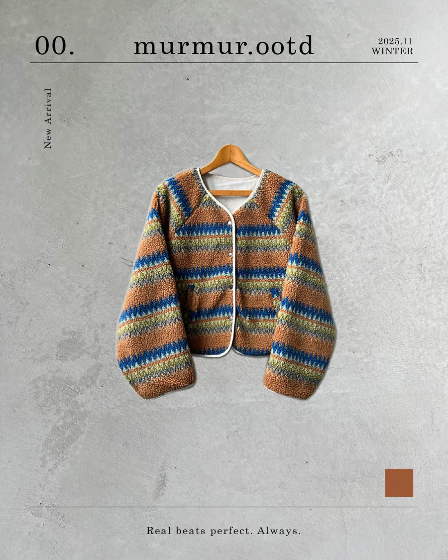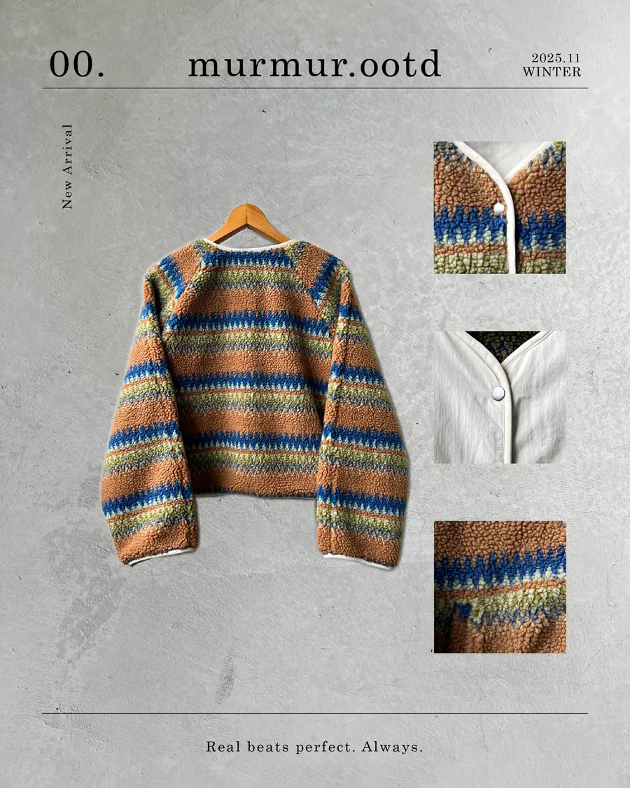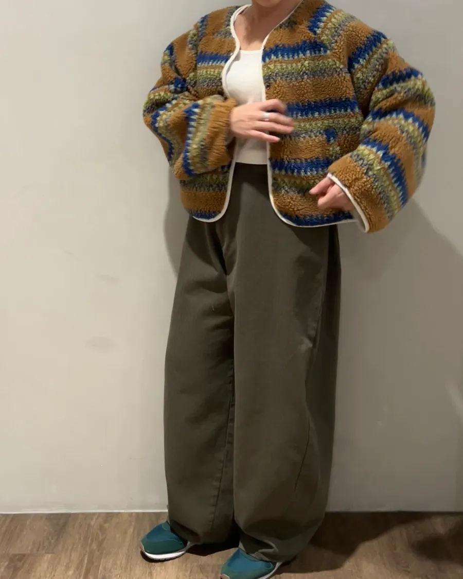 短版設計更顯修長,不過吸引我的還有特殊花樣搭配搖粒絨獨特顆粒感,說是印象派點描畫也不為過,而且隨你心情雙面皆可穿。