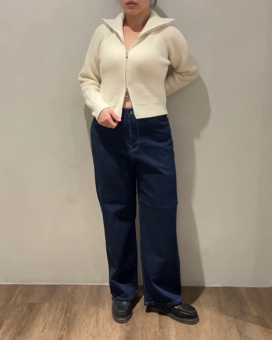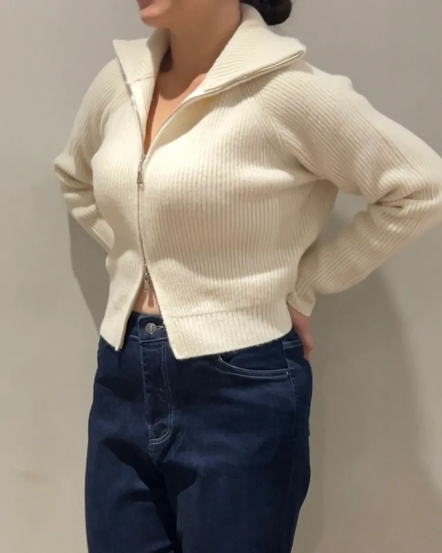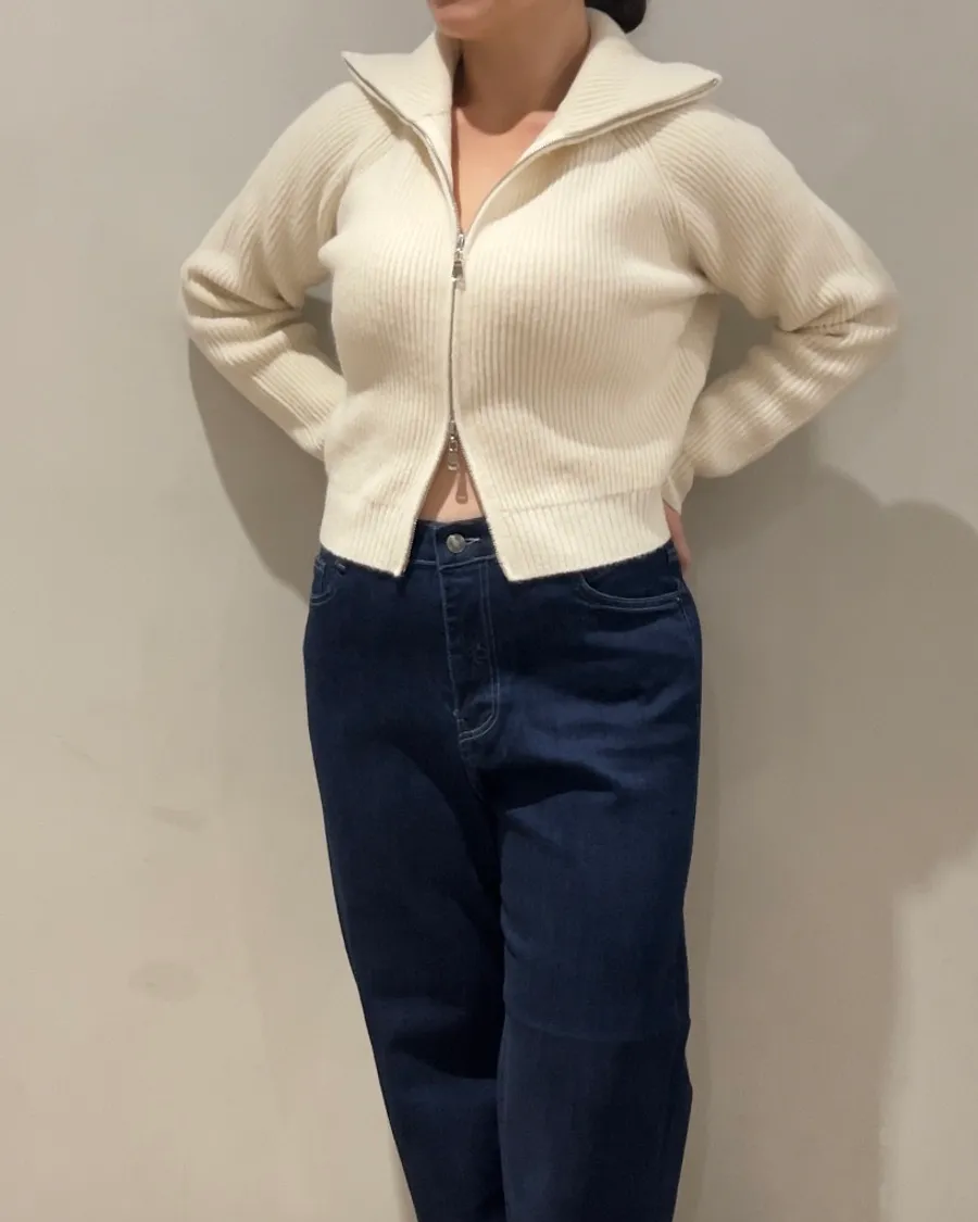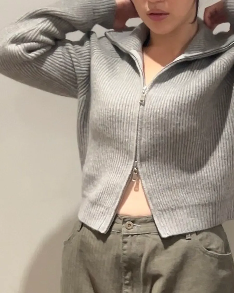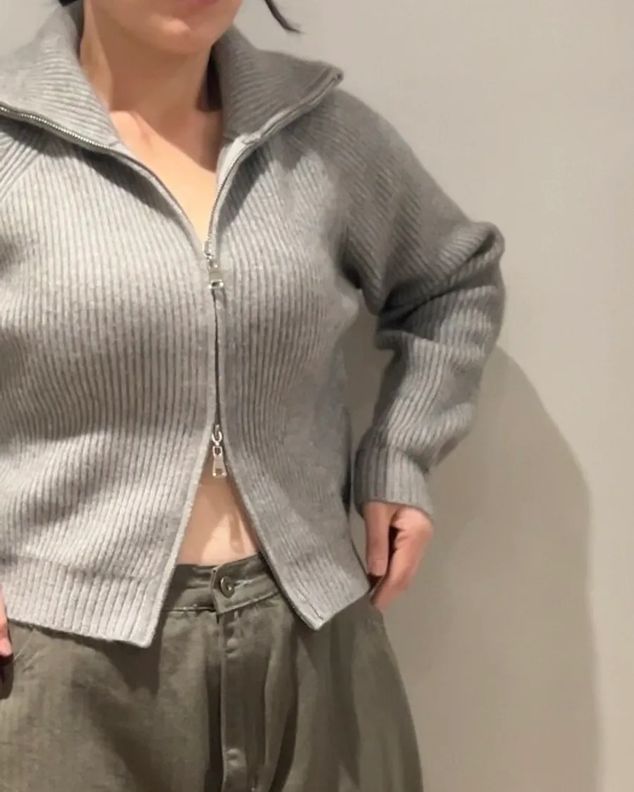 適當展現肌膚其實可以製造視覺修飾感,上下拉鍊開襟設計,搭配高腰褲,這個冬天除了麻辣鍋會辣,你也可以辣一下。