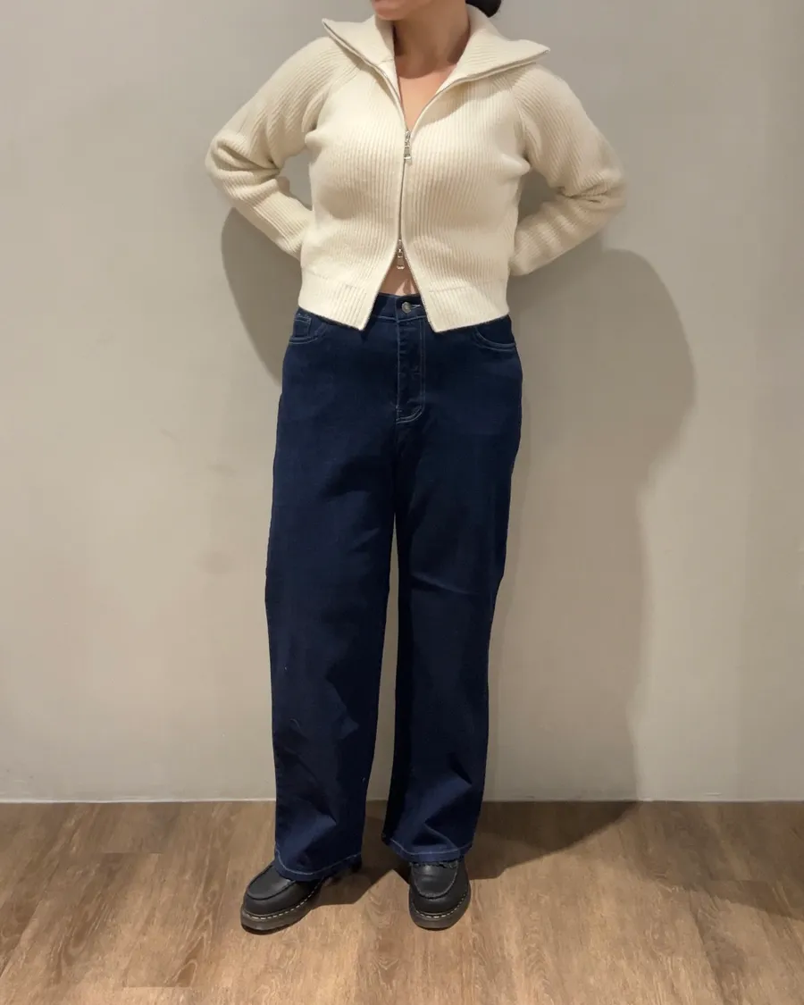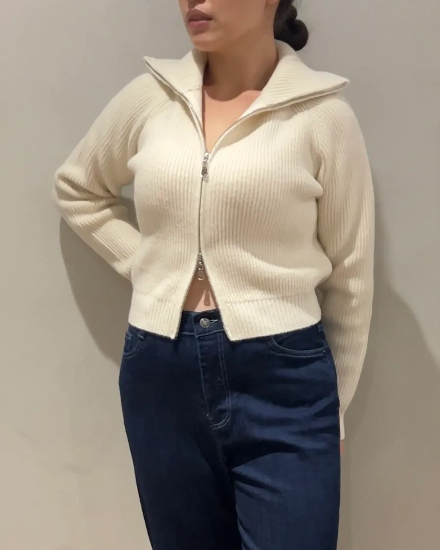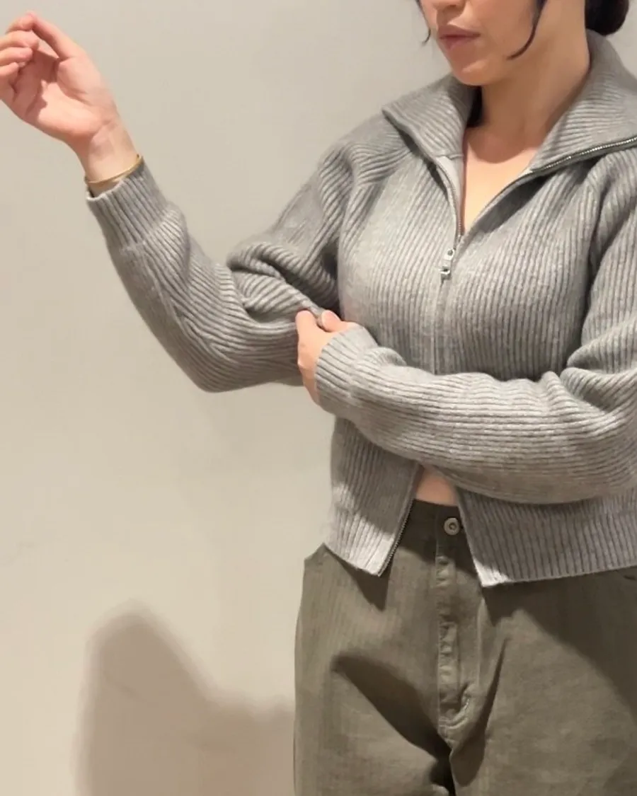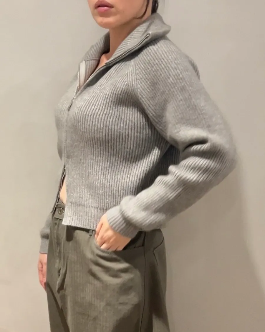 適當展現肌膚其實可以製造視覺修飾感,上下拉鍊開襟設計,搭配高腰褲,這個冬天除了麻辣鍋會辣,你也可以辣一下。