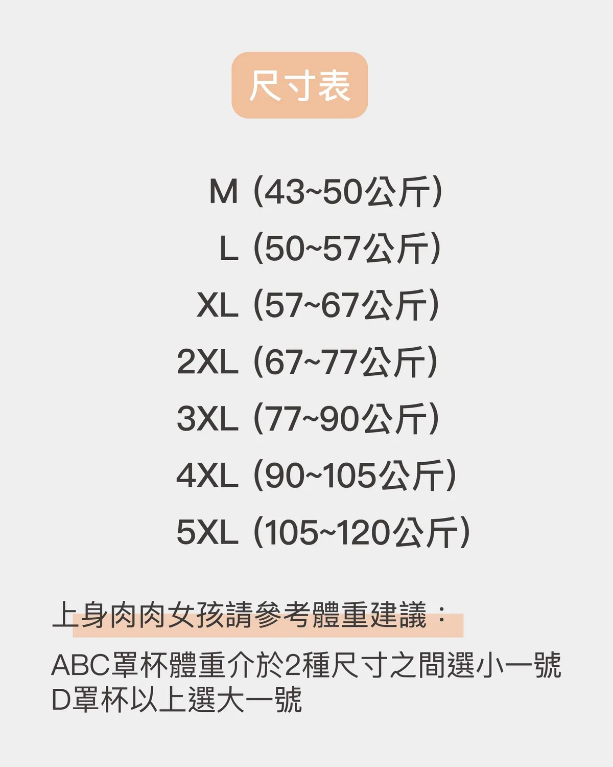 🧝阿溫尺寸 (cm) 身高167 體重67 Bra Top 實穿感受 XL:貼身修飾,拆肩帶穩定不會掉 2XL:舒適自在,介意小肚肚可大一號 |上胸圍 96|下胸圍 83|😎 上身肉肉女孩請參考體重建議😎 ABC罩杯,體重介於2種尺寸之間選小一號D罩杯,體重介於2種尺寸之間選大一號